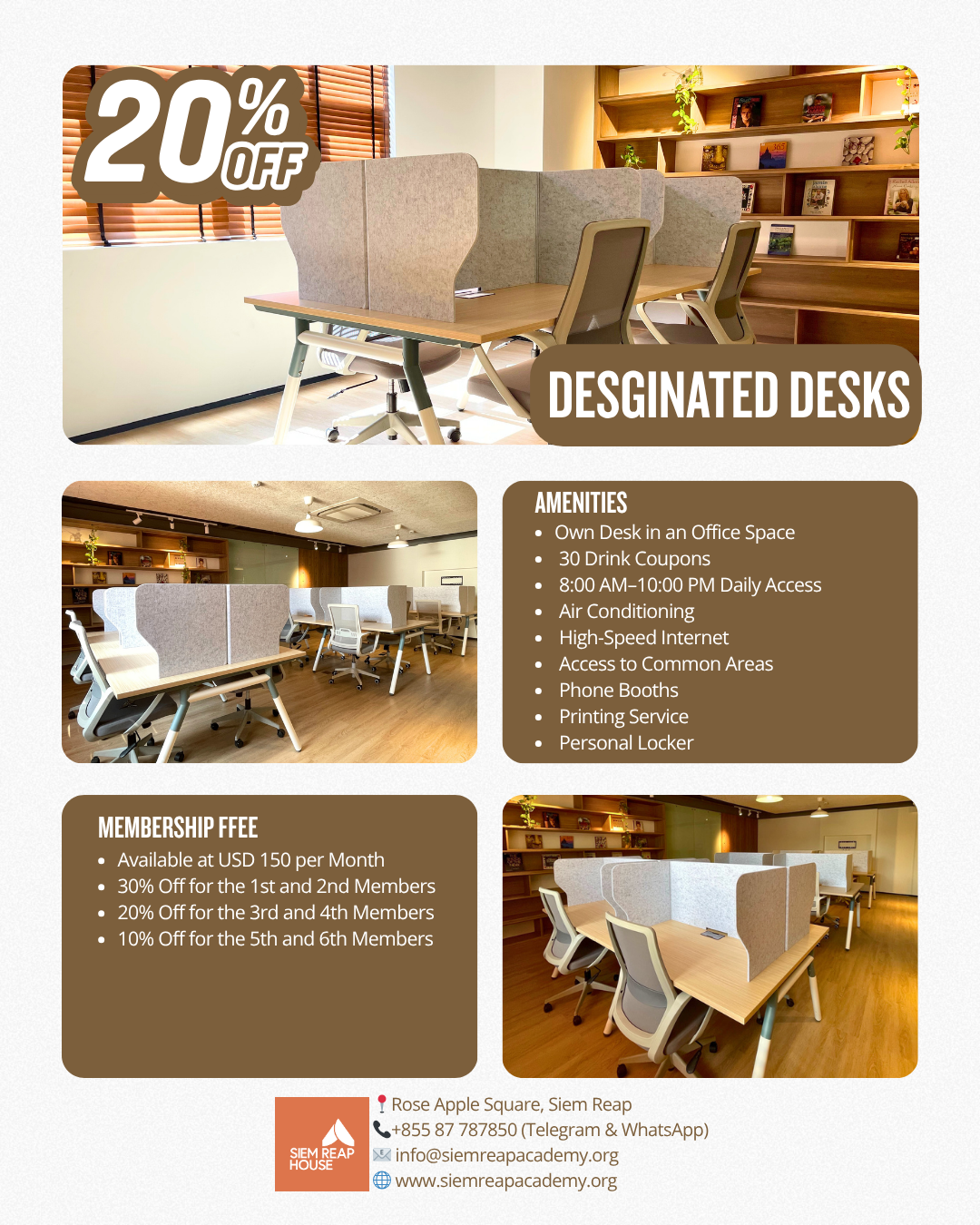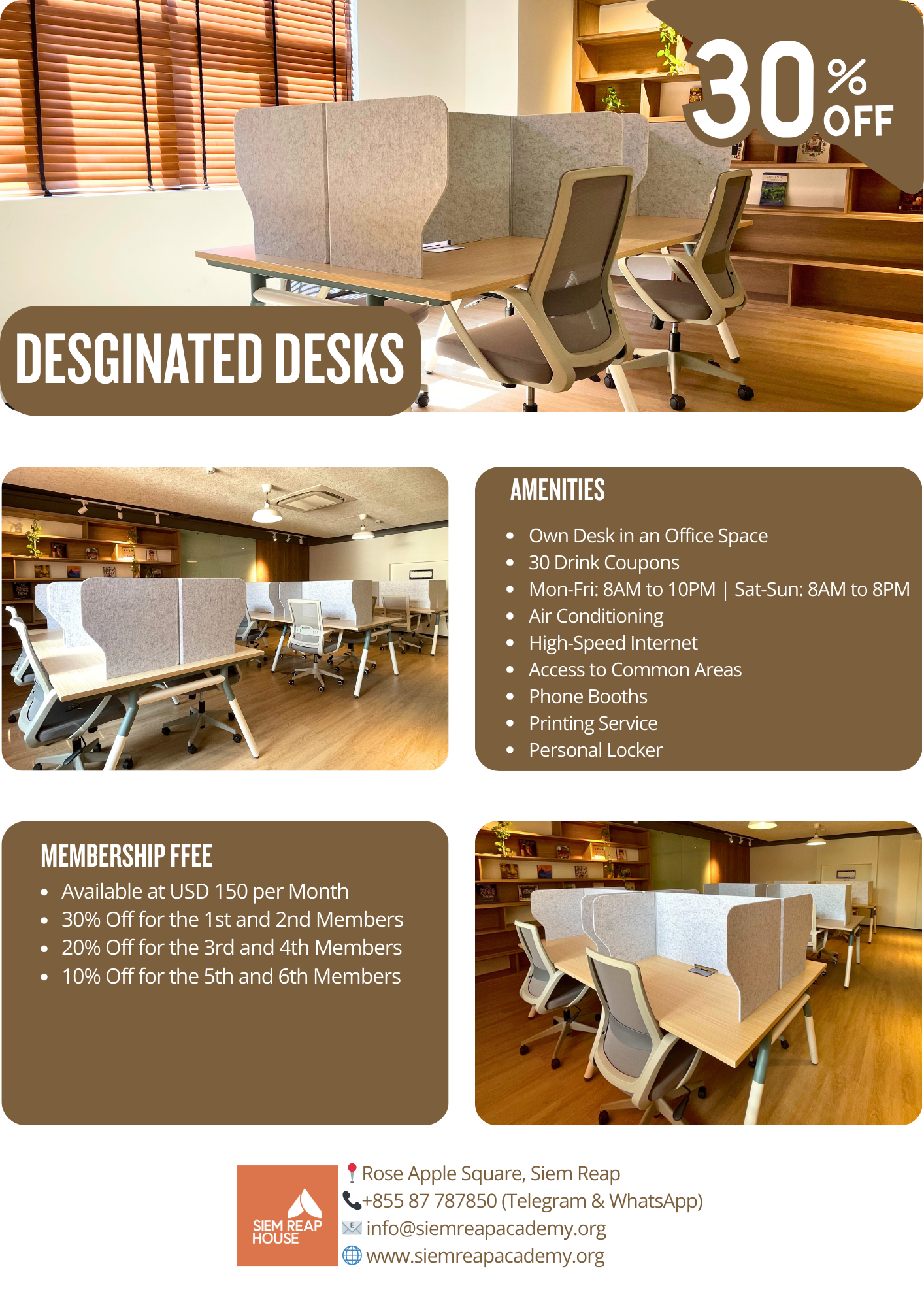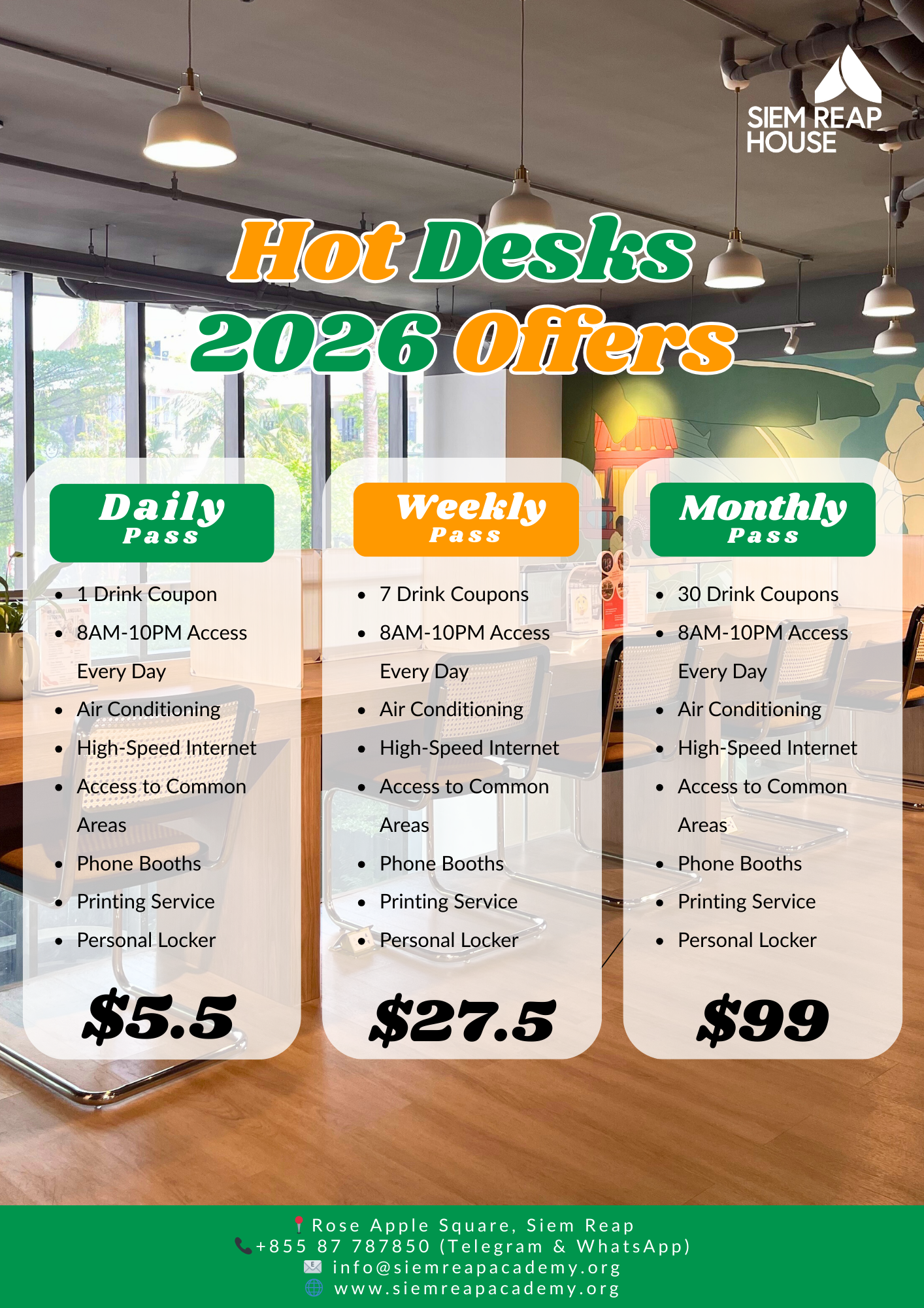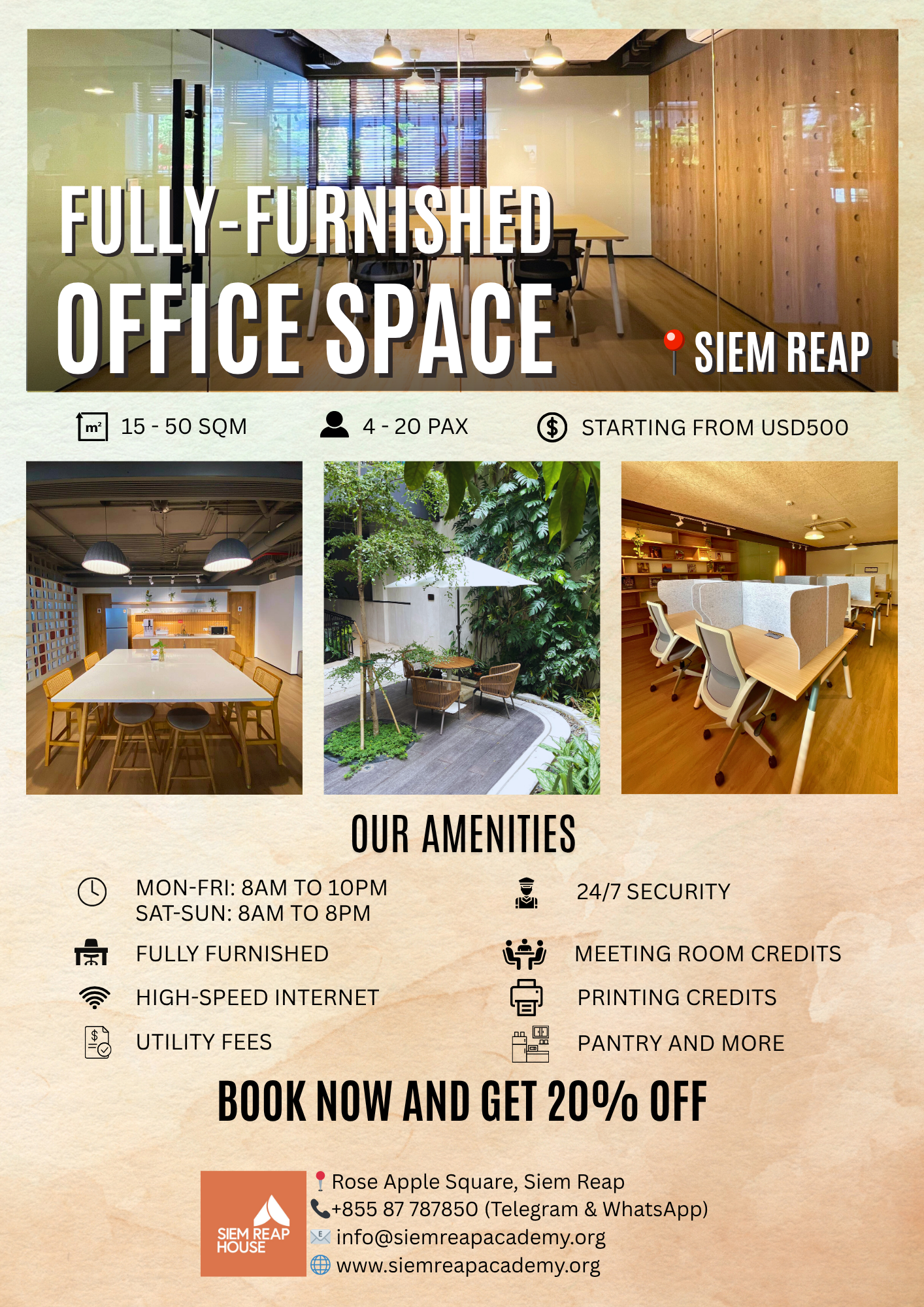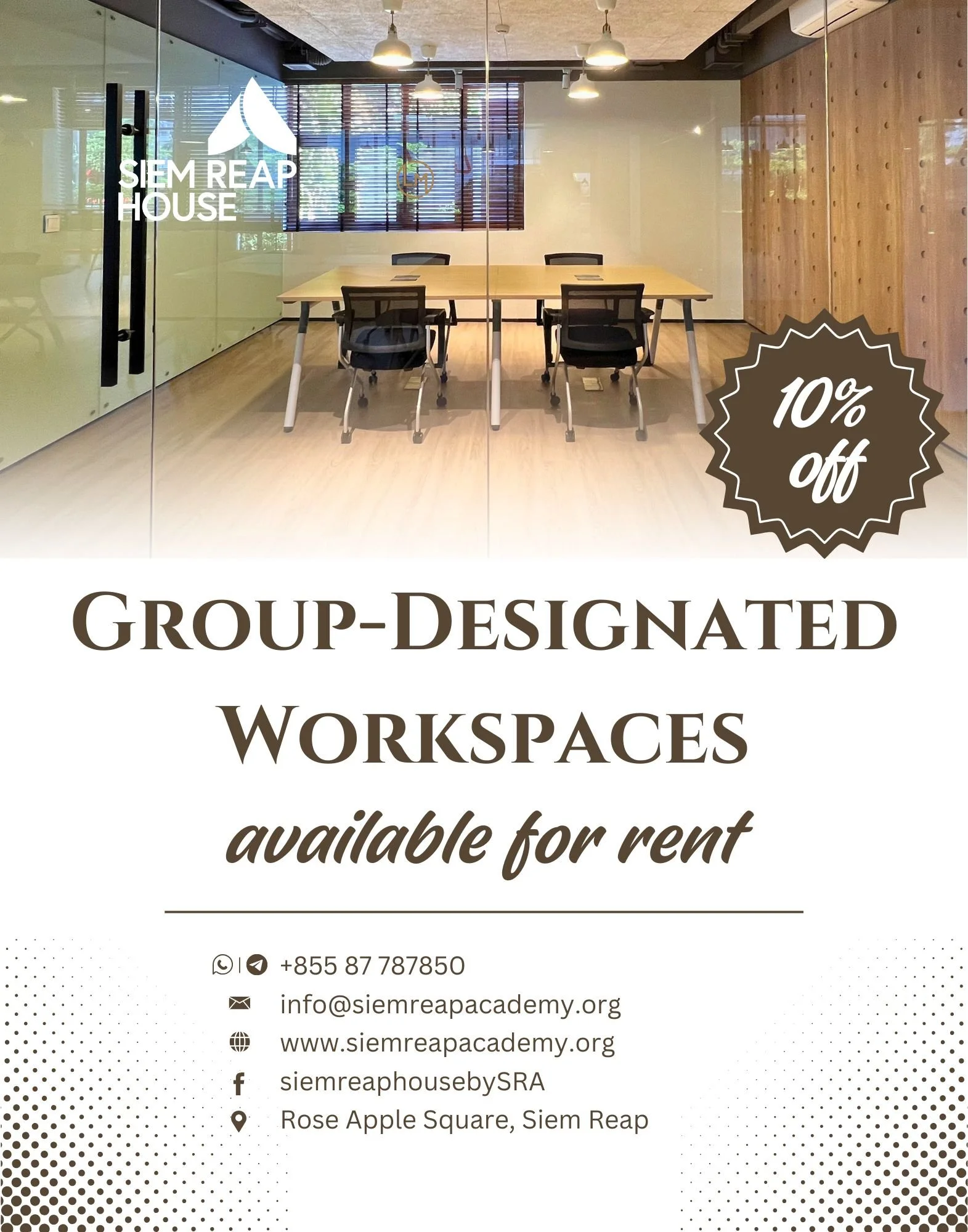 Siem Reap House offers tailored working solutions, including private offices, co-working spaces, meeting rooms, event venues, administrative support, and virtual hosting to meet the diverse needs of individuals, businesses and organizations with purpose.